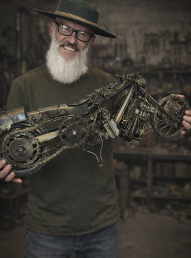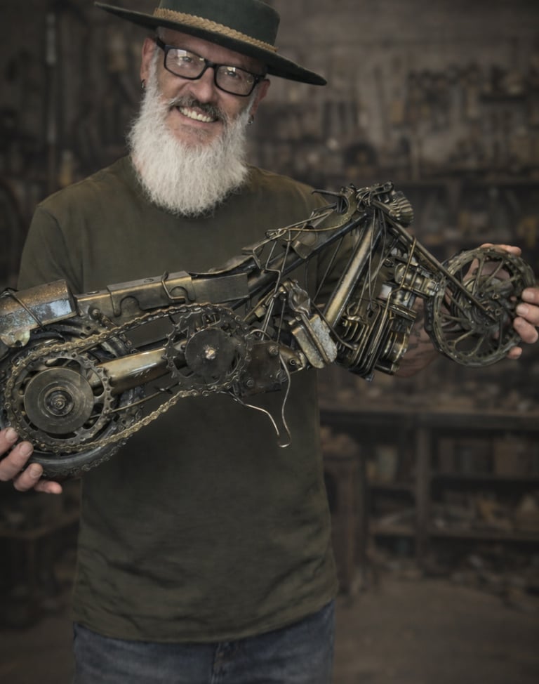 Depois de anos trabalhando em um ramo convencional, agora me destaco por minhas obras feitas com materiais recicláveis, especialmente o metal.